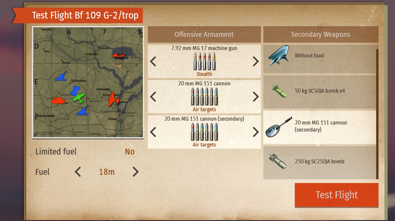 On a number of German fighters, load the stock 7.92 mm MG 17 with a “Stealth” belt for higher damage, and let the cannons do the main work. If you install additional wing-mounted 20 mm MG 151s, choose “Air Targets” with an emphasis on HE, making it the fastest way to break aircraft apart. On the Soviet La-5FN and Yak-3, the 20 mm ShVAK is especially effective with “Ground Targets” or “AP” belts, thanks to the higher share of AP, helping to destroy tough modules. The American 12.7 mm Browning M2 on the P-51C-10, P-63A-5, F4U-4, P-47D-22-RE, and P-40E-1 works reliably with the “Universal” belt, as the balance of incendiary and AP suits most tasks.